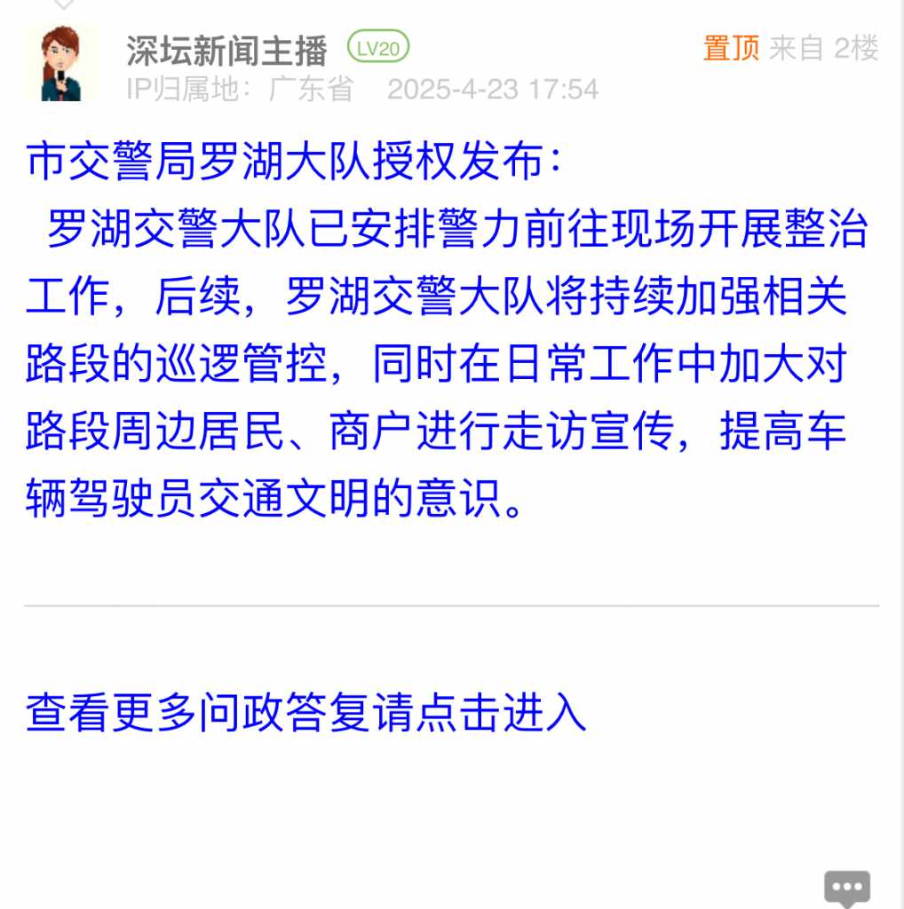 罗湖交警大队已安排警力前往现场开展整治工作,后续,罗湖交警大队将持续加强相关路段的巡逻管控,同时在日常工作中加大对路段周边居民、商户进行走访宣传,提高车辆驾驶员交通文明的意识。