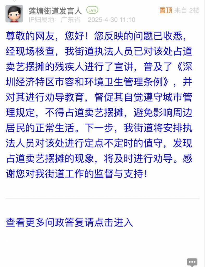 尊敬的网友,您好!您反映的问题已收悉,经现场核查,我街道执法人员已对该处占道卖艺摆摊的残疾人进行了宣讲,普及了《深圳经济特区市容和环境卫生管理条例》,并对其进行劝导教育,督促其自觉遵守城市管理规定,不得占道卖艺摆摊,避免影响周边居民的正常生活。下一步,我街道将安排执法人员对该处进行定点不定时的值守,发现占道卖艺摆摊的现象,将及时进行劝导。感谢您对我街道工作的监督与支持!