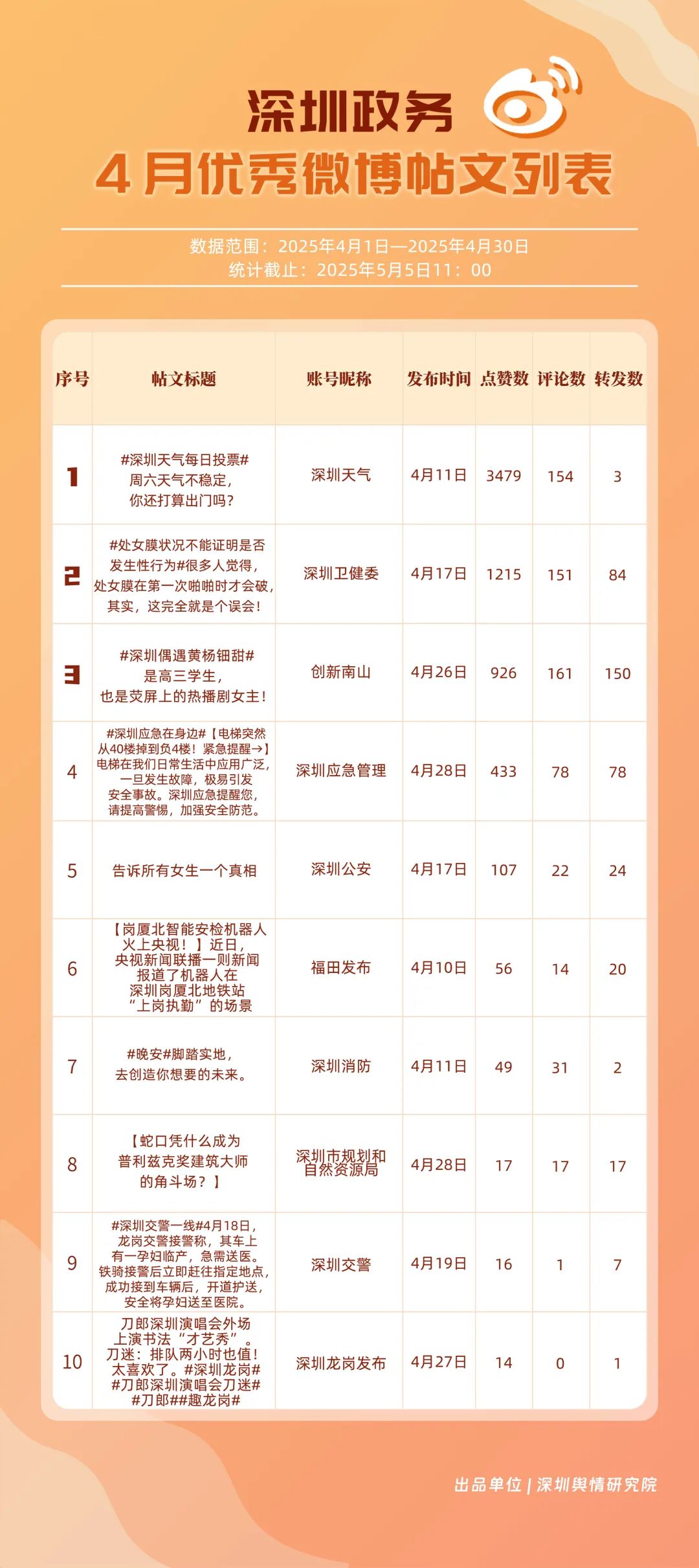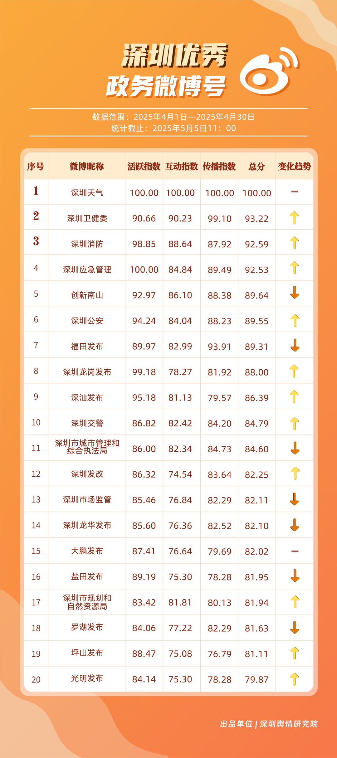 4月,“深圳天气”“深圳卫健委”“深圳消防”“深圳应急管理”“创新南山”“深圳公安”“福田发布”“深圳龙岗发布”“深汕发布”“深圳交警”等20个账号入选“优秀政务微博号”。值得一提的是,“深圳天气”在多个指标中获得满分,其气象信息的趣味性和实用性受到市民认可;“深圳卫健委”“深圳消防”“深圳应急管理”也在信息传播、互动服务等方面持续发力,以超过90分的总分紧跟其后;“深汕发布”“深圳交警”相较于3月在榜单排名有所提升,展现出强劲的发展势头。这些优秀政务微博号的脱颖而出,不仅体现了各自的运营实力,更反映出深圳政务新媒体在微博平台的蓬勃发展态势。