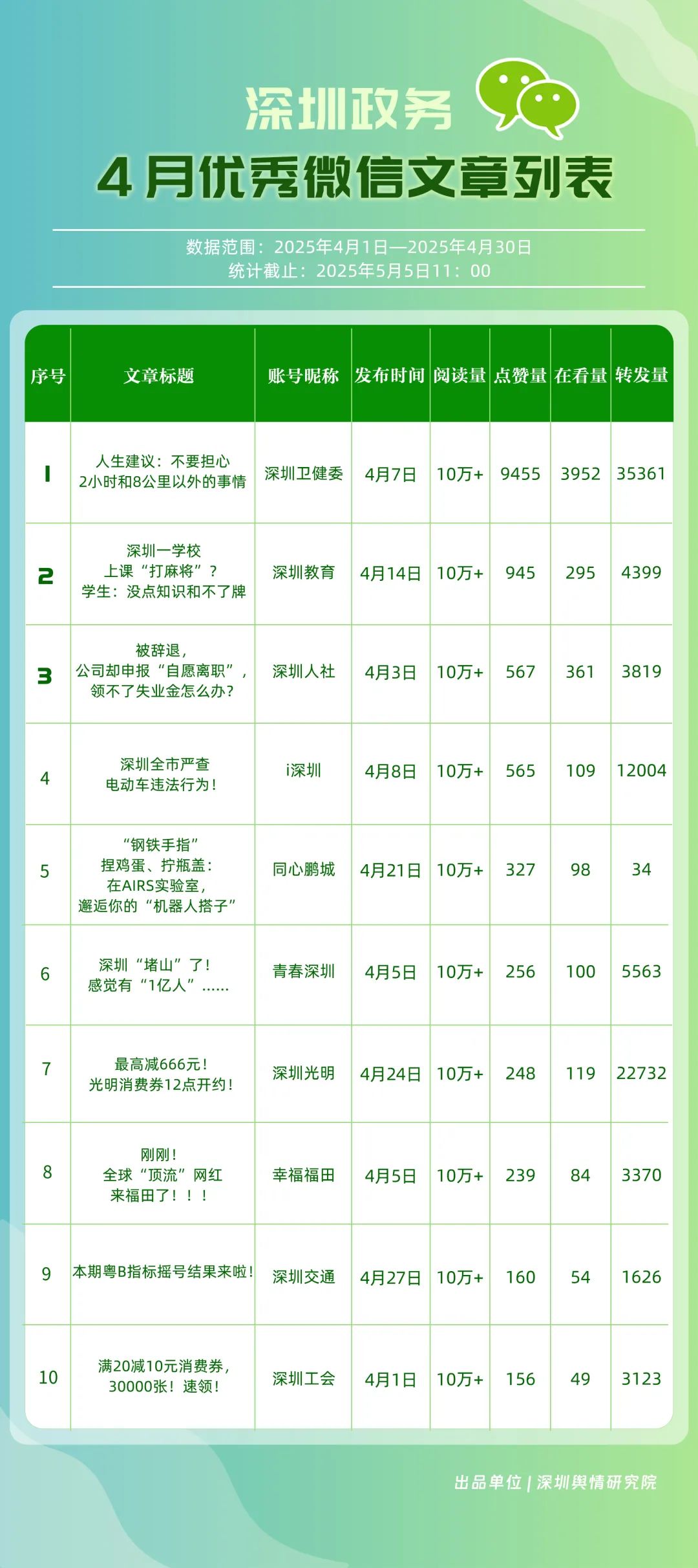 4月,包括“深圳卫健委”“深圳龙岗发布”“幸福福田”“深圳光明”“i深圳”“创新南山”“青春深圳”“深圳交通”“深圳教育”“滨海宝安”等在内的30个账号入选“深圳优秀政务微信公众号”。其中,“深圳卫健委”在活跃指数、互动指数、传播指数上均拿到满分,4月共有67篇推文阅读量超10万次,综合得分稳居榜单首位;“深圳龙岗发布”同样表现亮眼,4月共产出13篇阅读量超10万次的爆款文章,综合得分排名第二位;“幸福福田”则凭借持续输出的高质量内容,排在榜单第三位。“深圳光明”“i深圳”“创新南山”“青春深圳”也凭借扎实的内容功底与良好的运营策略,总分超85分。上榜账号的亮眼成绩,不仅彰显了各自的传播优势,更展现出各新媒体矩阵在微信公众平台的传播势能正持续攀升。