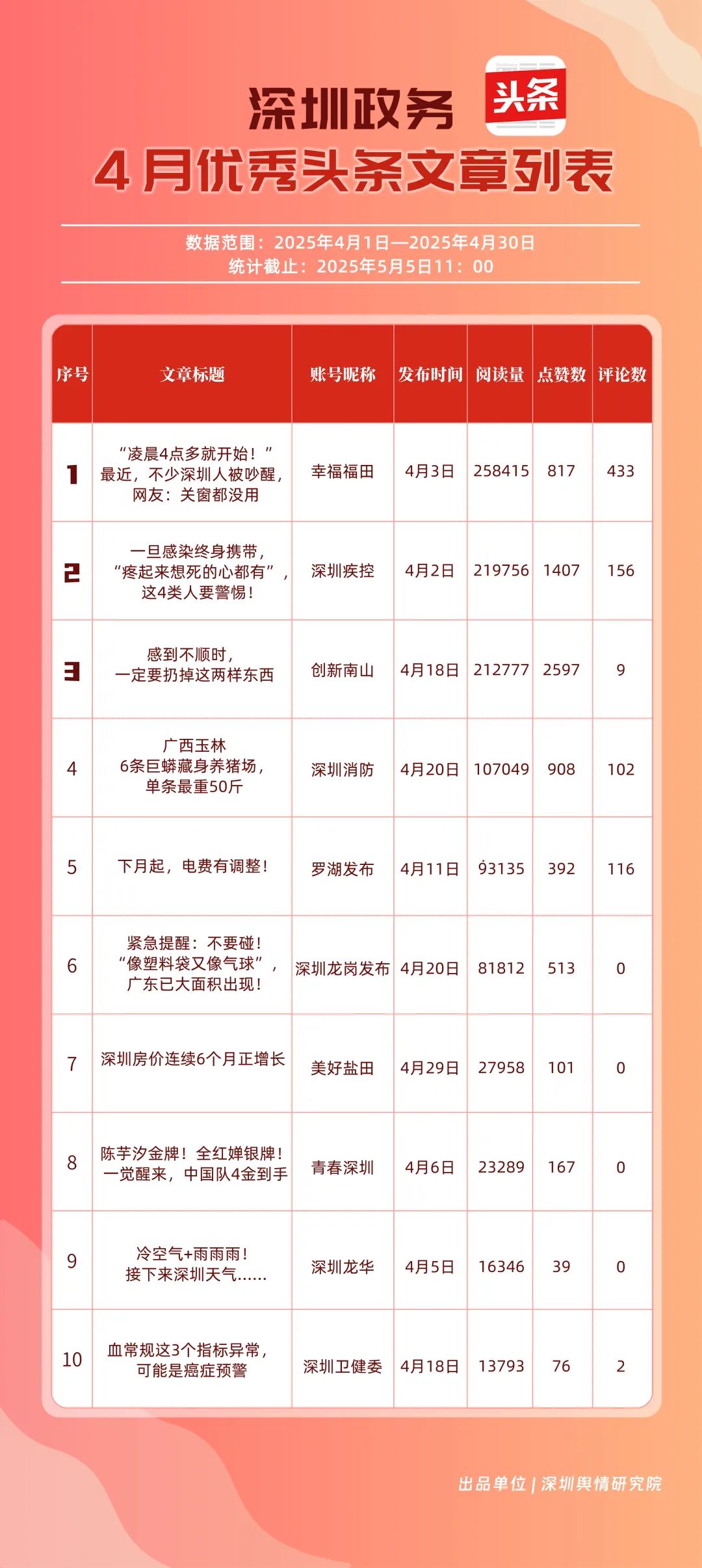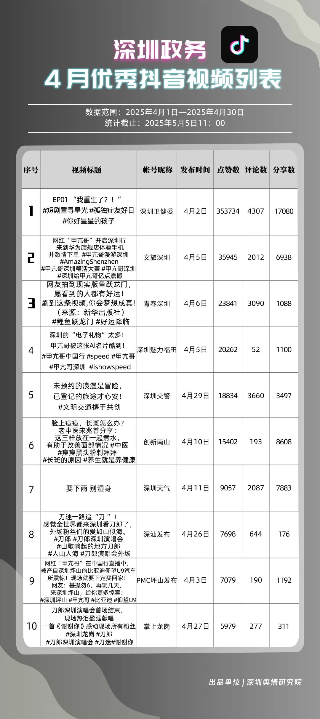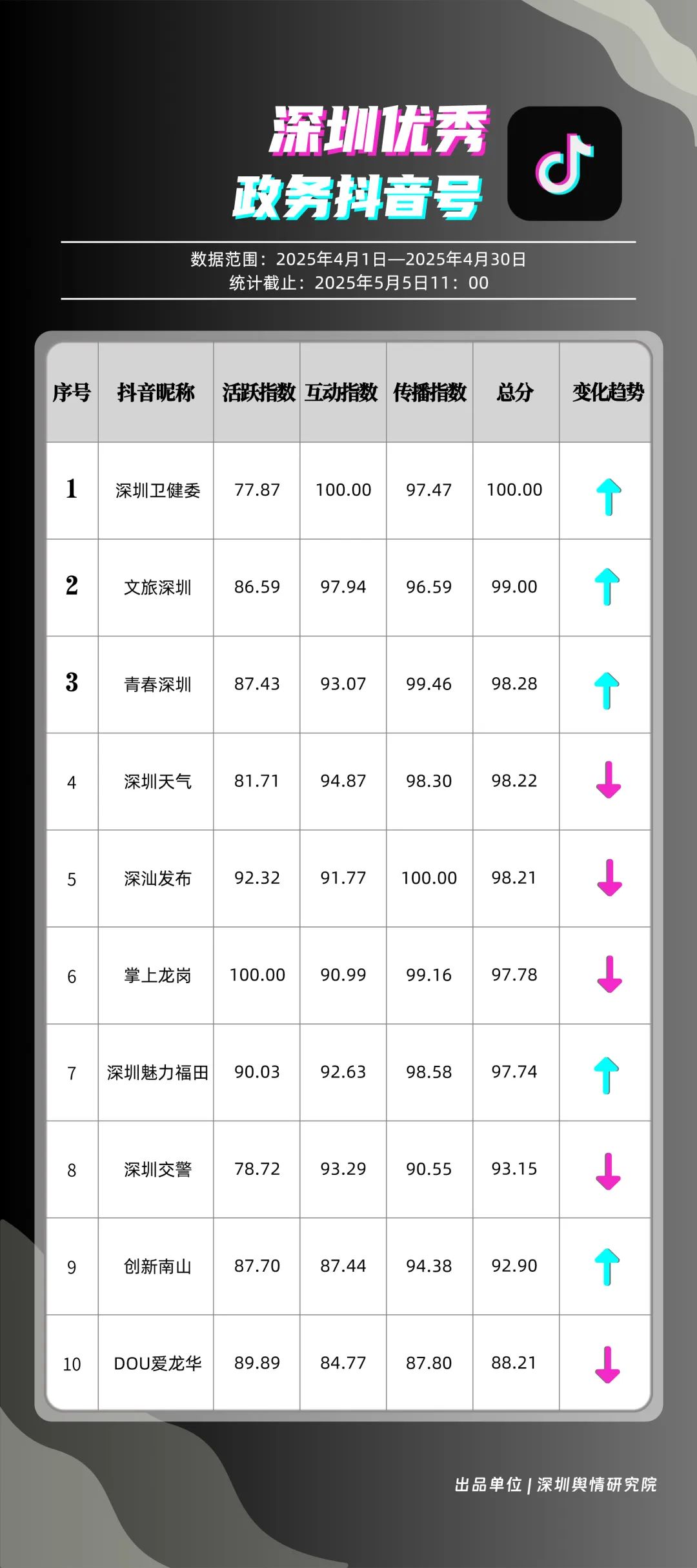 4月,“深圳卫健委”“文旅深圳”“青春深圳”“深圳天气”“深汕发布”“掌上龙岗”“深圳魅力福田”“深圳交警”“创新南山”“DOU爱龙华”共10个政务抖音号获得“优秀政务抖音号”称号。4月,“深圳卫健委”“文旅深圳”“青春深圳”凭借新颖的内容策划、生动的短视频呈现方式,实现排名提升,位居榜单前三。“深圳天气”“深汕发布”紧随其后,以优质实用的内容、接地气的表达,持续扩大政务新媒体的传播声量。上榜账号积极探索创新传播路径,以生动有趣的方式传递政务信息,为深圳政务新媒体在短视频领域的发展注入新活力。