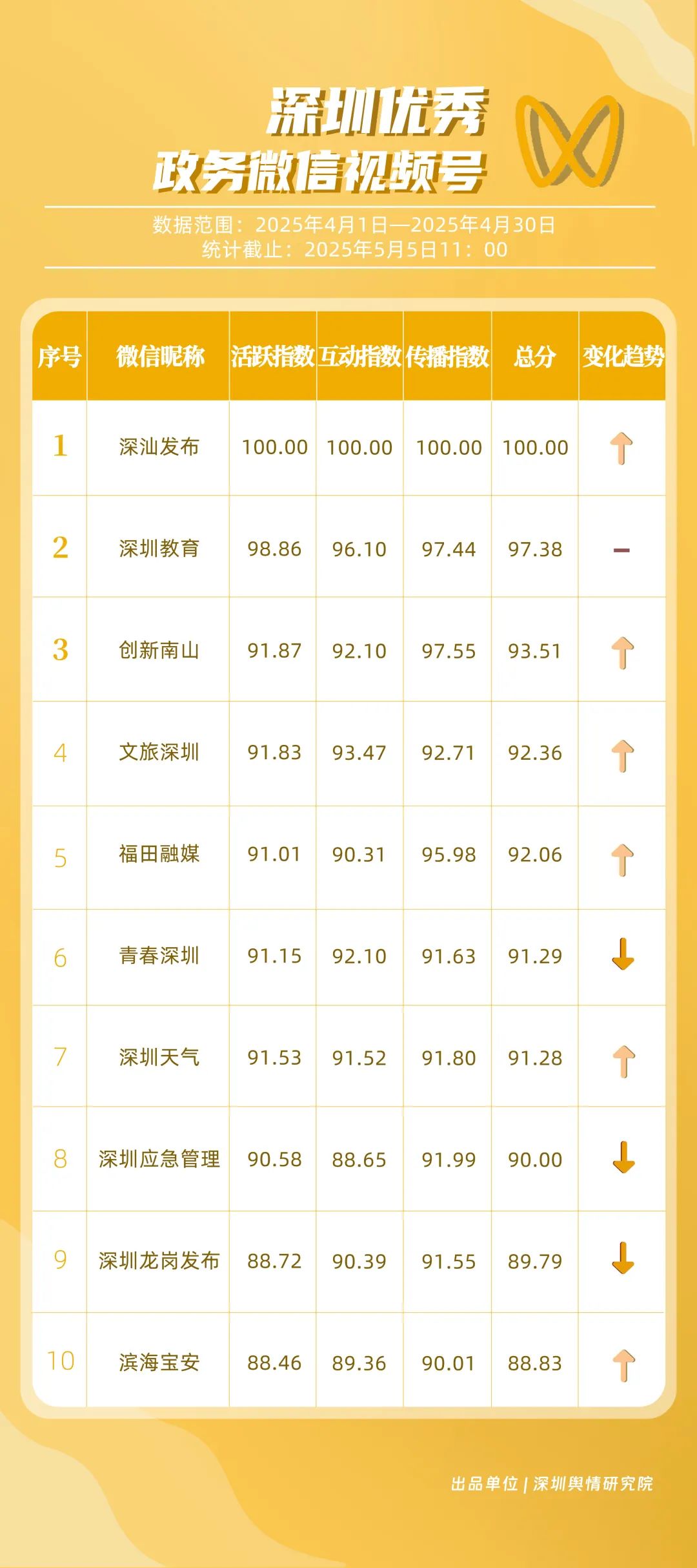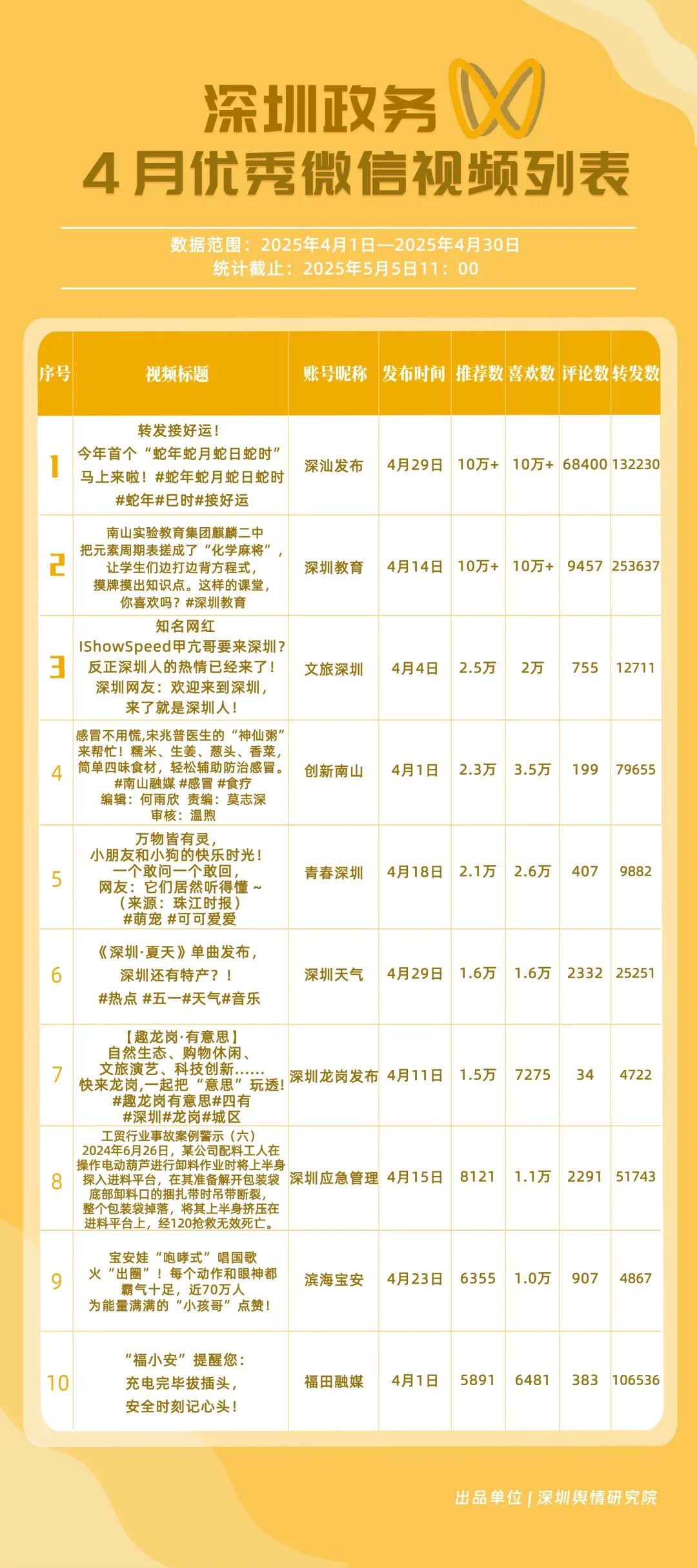 4月,获“深圳优秀政务微信视频号”称号的是“深汕发布”“深圳教育”“创新南山”“文旅深圳”“福田融媒”“青春深圳”“深圳天气”“深圳应急管理”“深圳龙岗发布”“滨海宝安”。其中,“深汕发布”凭借亮眼的数据表现成为榜首,其一条有关“蛇年蛇月蛇日蛇时”的视频作品点赞量超10万次、评论量超6.8万次,转发量超13万次;“深圳教育”持续稳定输出优质内容,以扎实的运营实力巩固自身影响力,位居榜单第2位;“创新南山”“文旅深圳”“福田融媒”分别位列榜单第3、4、5位,总分超92分,在区域形象宣传、文旅资源推广等方面展现出卓越的传播效能,成为传递区域特色与发展动态的重要窗口。