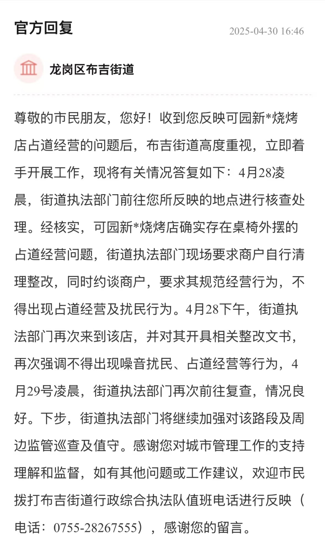 针对烧烤店占道经营与凌晨噪音扰民问题,街道办行动迅速,回应中处置流程清晰。在现场核查确认违规事实后,街道办开具整改文书,开展复查、加强周边监管,解决商业经营店铺扰民问题,以规范行动守护居民“宁静权”,展现了基层执法的高效务实,切实提升了群众生活幸福感。