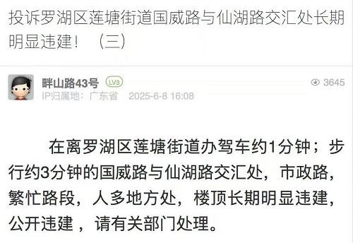 14. 帖文《投诉罗湖区莲塘街道国威路与仙湖路交汇处长期明显违建!(三)》