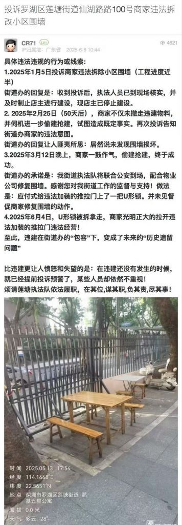 12. 帖文《投诉罗湖区莲塘街道仙湖路路100号商家违法拆改小区围墙》
