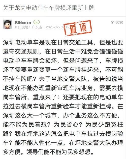 11. 帖文《关于龙岗电动单车车牌损坏重新上牌》