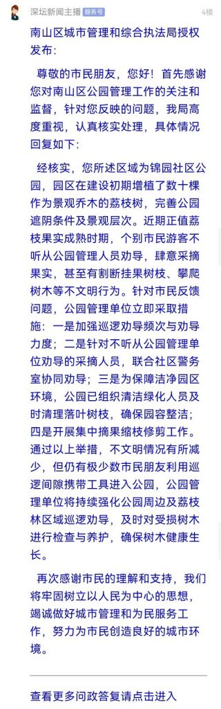 尊敬的市民朋友,您好!首先感谢您对南山区公园管理工作的关注和监督,针对您反映的问题,我局高度重视,认真核实处理,具体情况回复如下:经核实,您所述区域为锦园社区公园,园区在建设初期增植了数十棵作为景观乔木的荔枝树,完善公园遮阴条件及景观层次。近期正值荔枝果实成熟时期,个别市民游客不听从公园管理人员劝导,肆意采摘果实,甚至有割断挂果树枝、攀爬树木等不文明行为。针对市民反馈问题,公园管理单位立即采取措施:一是加强巡逻劝导频次与劝导力度;二是针对不听从公园管理单位劝导的采摘人员,联合社区警务室协同劝导;三是为保障洁净园区环境,公园已组织清洁绿化人员及时清理落叶树枝,确保园容整洁;四是开展集中摘果缩枝修剪工作。通过以上举措,不文明情况有所减少,但仍有极少数市民朋友利用巡逻间隙携带工具进入公园,公园管理单位将持续强化公园周边及荔枝林区域巡逻劝导,及时对受损树木进行检查与养护,确保树木健康生长。再次感谢市民的理解和支持,我们将牢固树立以人民为中心的思想,竭诚做好城市管理和为民服务工作,努力为市民创造良好的城市环境。