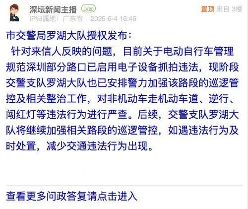 针对来信人反映的问题,目前关于电动自行车管理规范深圳部分路口已启用电子设备抓拍违法,现阶段交警支队罗湖大队也已安排警力加强该路段的巡逻管控及相关整治工作,对非机动车走机动车道、逆行、闯红灯等违法行为进行严查。后续,交警支队罗湖大队将继续加强相关路段的巡逻管控,如遇违法行为及时处置,减少交通违法行为出现。