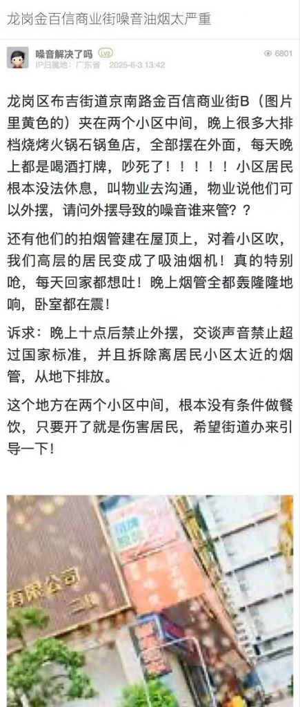 3. 帖文《龙岗金百信商业街噪音油烟太严重》