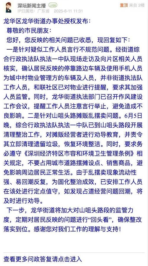 一是针对疑似工作人员言行不规范问题。经街道综合行政执法队执法一中队现场走访及向片区相关人员核实,确认居民反映的停靠路边车辆及使用手机人员为城中村物业管理方的车辆及人员,并非街道执法队工作人员,和联社区已对物业进行提醒,要求其加强人员监管。同时,龙华街道执法部门已召开作风建设工作会议,提醒工作人员注意言行举止,避免造成不良影响。二是针对山咀头路摊贩乱摆卖问题。6月5日晚,综合行政执法队执法一中队已到山咀头路段开展清理整治工作,对摊贩经营者进行劝导教育,并责令其立即清理遗留垃圾,恢复环境整洁。同时,要求务必遵守《深圳经济特区市容和环境卫生管理条例》相关规定,不要占用城市道路摆摊设点、销售商品,避免影响周边居民正常生活。由于乱摆卖现象流动性强、易回潮反复,为固化整治成效,已安排工作人员在该处进行定点值守,如发现占道经营问题回潮,将及时进行劝导。