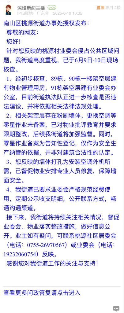 接下来,我街道将持续关注相关情况,业主如有疑问,可联系桃源社区居委会(电话:0755-26970567)反映。