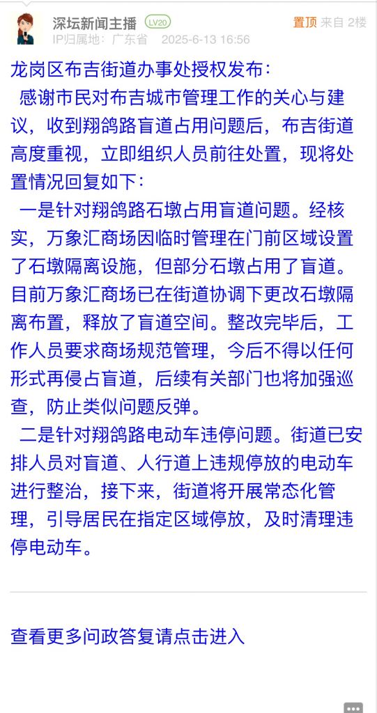 感谢市民对布吉城市管理工作的关心与建议,收到翔鸽路盲道占用问题后,布吉街道高度重视,立即组织人员前往处置,现将处置情况回复如下: