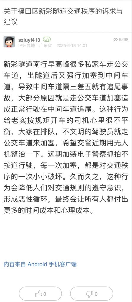 17. 帖文《关于福田区新彩隧道交通秩序的诉求与建议》