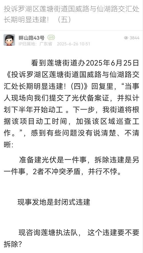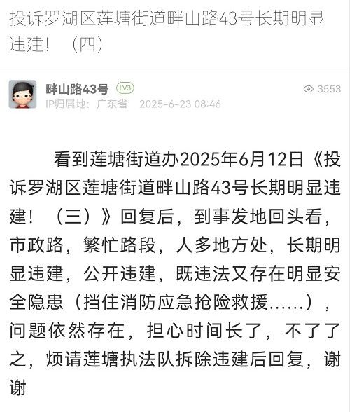 3. 帖文《投诉罗湖区莲塘街道畔山路43号长期明显违建!(四)》