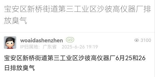 15. 帖文《宝安区新桥街道第三工业区沙彼高仪器厂排放臭气》《宝安新桥三工业区沙彼高仪器厂6月27-28日仍排放臭气扰民》