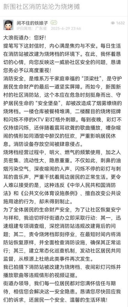 23. 帖文《新围社区消防站沦为烧烤摊》
