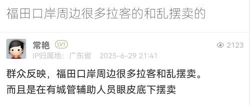 2025年6月29日,我街道执法人员前往辖区福田口岸周边裕亨路、金地名津广场及海悦华城等区域现场守点巡查,发现5宗乱摆卖行为。执法人员现场进行政策宣传,明确告知当事人禁止在该区域摆摊设点,并依法劝离。6月30日巡查时未发现流动摊贩乱摆卖情况。