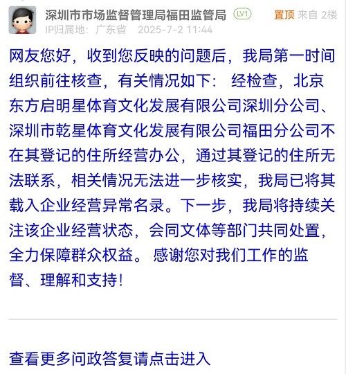 网友您好,收到您反映的问题后,我局第一时间组织前往核查,有关情况如下: 经检查,北京东方启明星体育文化发展有限公司深圳分公司、深圳市乾星体育文化发展有限公司福田分公司不在其登记的住所经营办公,通过其登记的住所无法联系,相关情况无法进一步核实,我局已将其载入企业经营异常名录。下一步,我局将持续关注该企业经营状态,会同文体等部门共同处置,全力保障群众权益。 感谢您对我们工作的监督、理解和支持!
