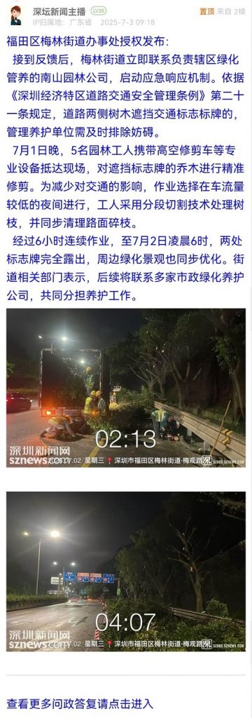 接到反馈后,梅林街道立即联系负责辖区绿化管养的南山园林公司,启动应急响应机制。依据《深圳经济特区道路交通安全管理条例》第二十一条规定,道路两侧树木遮挡交通标志标牌的,管理养护单位需及时排除妨碍。