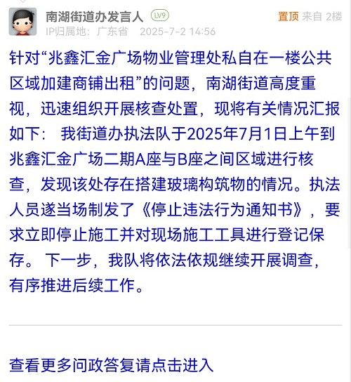 针对“兆鑫汇金广场物业管理处私自在一楼公共区域加建商铺出租”的问题,南湖街道高度重视,迅速组织开展核查处置,现将有关情况汇报如下: 我街道办执法队于2025年7月1日上午到兆鑫汇金广场二期A座与B座之间区域进行核查,发现该处存在搭建玻璃构筑物的情况。执法人员遂当场制发了《停止违法行为通知书》,要求立即停止施工并对现场施工工具进行登记保存。 下一步,我队将依法依规继续开展调查,有序推进后续工作。