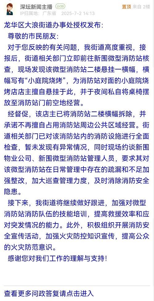 经督促,该店主已将消防站二楼横幅拆除,并承诺不再擅自占用消防站周边公共区域经营。街道相关部门已对该消防站内的消防设施进行全面检查,暂未发现有异常情况,同时现场约谈新围物业公司、新围微型消防站管理人员,要求其对该微型消防站在日常管理中存在的疏漏和不足加强整改,加大巡查管理力度,及时消除消防安全隐患。