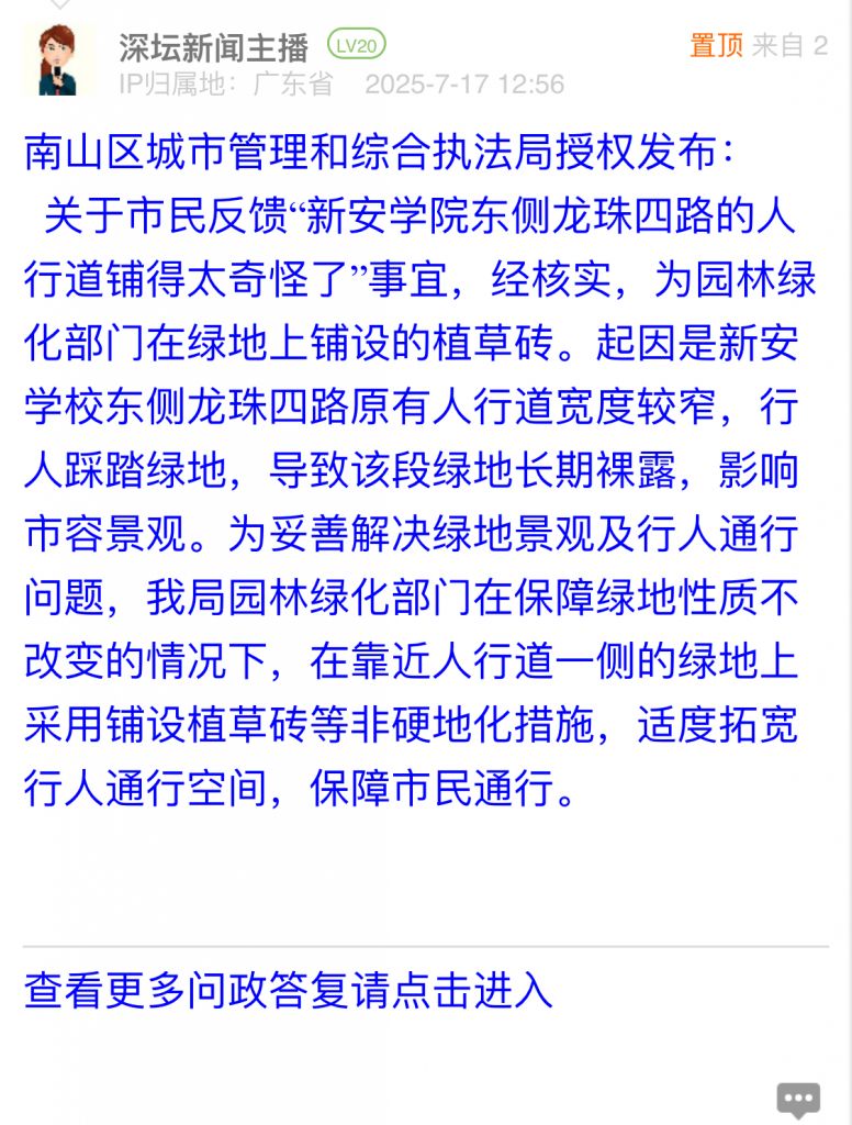 关于市民反馈“新安学院东侧龙珠四路的人行道铺得太奇怪了”事宜,经核实,为园林绿化部门在绿地上铺设的植草砖。起因是新安学校东侧龙珠四路原有人行道宽度较窄,行人踩踏绿地,导致该段绿地长期裸露,影响市容景观。为妥善解决绿地景观及行人通行问题,我局园林绿化部门在保障绿地性质不改变的情况下,在靠近人行道一侧的绿地上采用铺设植草砖等非硬地化措施,适度拓宽行人通行空间,保障市民通行。
