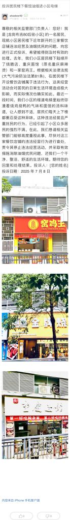 市生态环境局龙岗管理局执法人员于2025年7月8日16时5分到达现场进行调查处理,现场检查时该三家餐饮店均正常营业,油烟净化处理设施有开启,于餐饮店所在小区楼道的电梯口未闻到明显气味。经进一步核实,金牌烧鹅和窑鸡王经营食材均为半成品,店内只作加热处理,重庆面馆以汤粉面为主,加工产生的气味经收集处理后排放。针对油烟扰民问题,执法人员已现场要求该处餐饮店负责人在加工过程中紧闭厨房门窗,做好气味收集,同时做好油烟净化处理设施的清洗与维护工作,避免扰民。