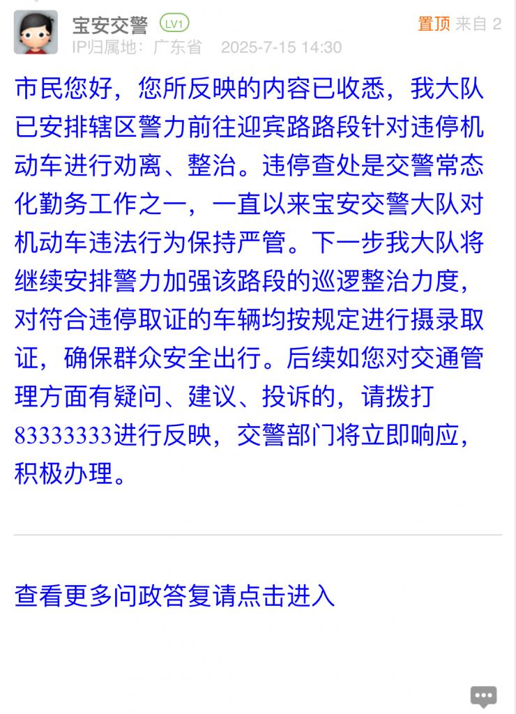 市民您好,您所反映的内容已收悉,我大队已安排辖区警力前往迎宾路路段针对违停机动车进行劝离、整治。违停查处是交警常态化勤务工作之一,一直以来宝安交警大队对机动车违法行为保持严管。下一步我大队将继续安排警力加强该路段的巡逻整治力度,对符合违停取证的车辆均按规定进行摄录取证,确保群众安全出行。后续如您对交通管理方面有疑问、建议、投诉的,请拨打83333333进行反映,交警部门将立即响应,积极办理。