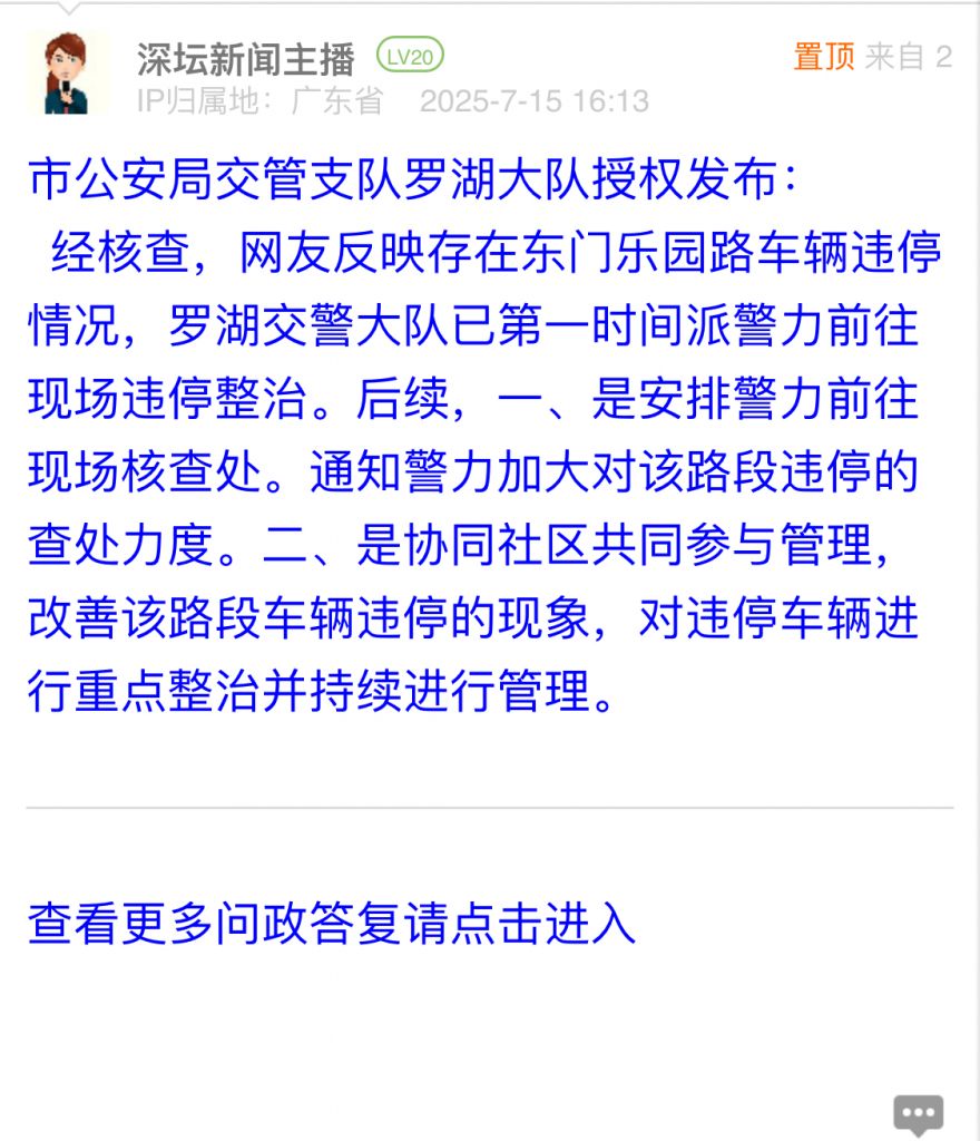 经核查,网友反映存在东门乐园路车辆违停情况,罗湖交警大队已第一时间派警力前往现场违停整治。后续,一、是安排警力前往现场核查处。通知警力加大对该路段违停的查处力度。二、是协同社区共同参与管理,改善该路段车辆违停的现象,对违停车辆进行重点整治并持续进行管理。