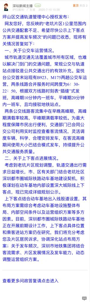 网友您好,您反映的“老坑片区1公里范围内公共交通配套不足、希望尽快公示上下客点方案并提高发车频次”的问题已收悉,现将有关情况答复如下: