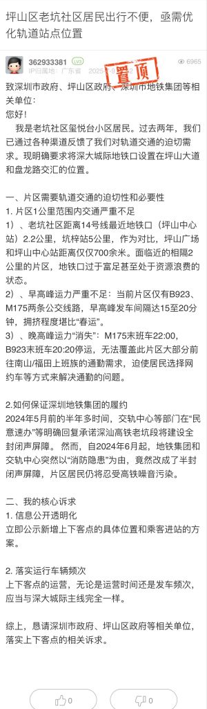 13. 帖文《坪山区老坑社区居民出行不便,亟需优化轨道站点位置》