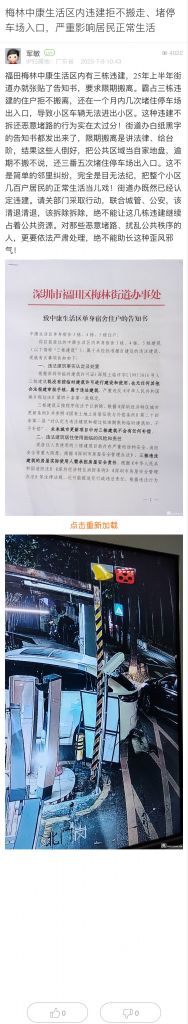 35. 帖文《梅林中康生活区内违建拒不搬走、堵停车场入口,严重影响居民正常生活》
