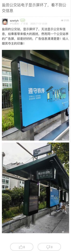 32. 帖文《盐田公交站电子显示屏坏了,看不到公交信息》