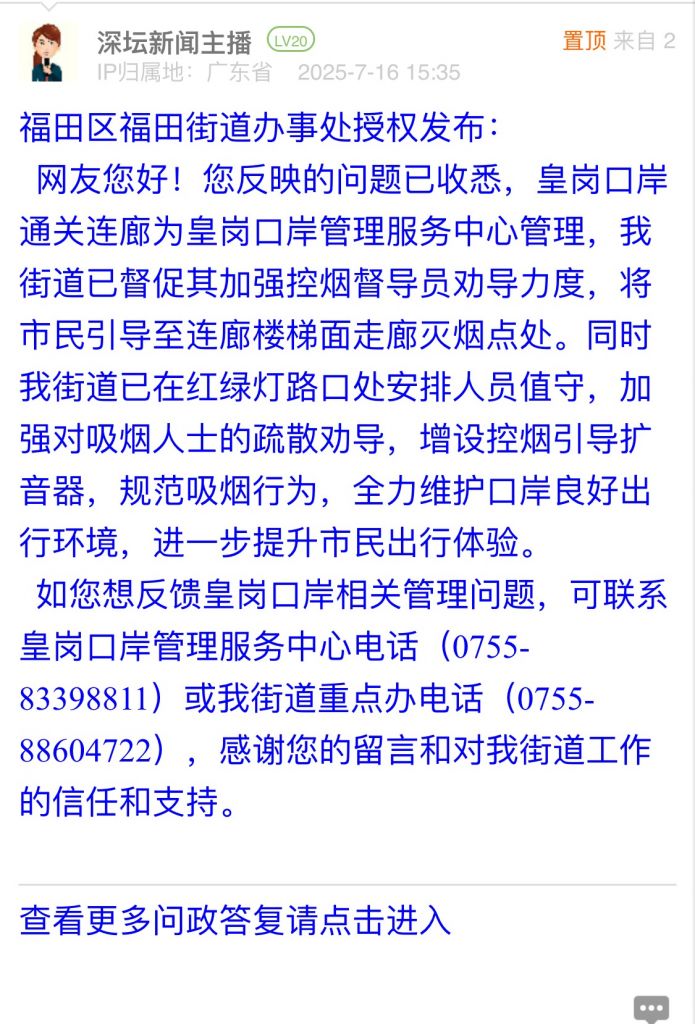网友您好!您反映的问题已收悉,皇岗口岸通关连廊为皇岗口岸管理服务中心管理,我街道已督促其加强控烟督导员劝导力度,将市民引导至连廊楼梯面走廊灭烟点处。同时我街道已在红绿灯路口处安排人员值守,加强对吸烟人士的疏散劝导,增设控烟引导扩音器,规范吸烟行为,全力维护口岸良好出行环境,进一步提升市民出行体验。