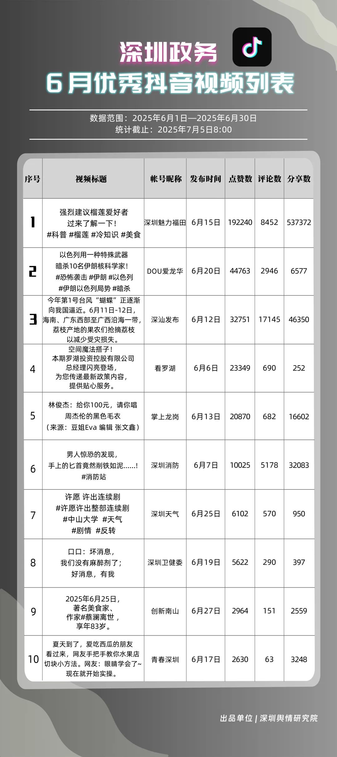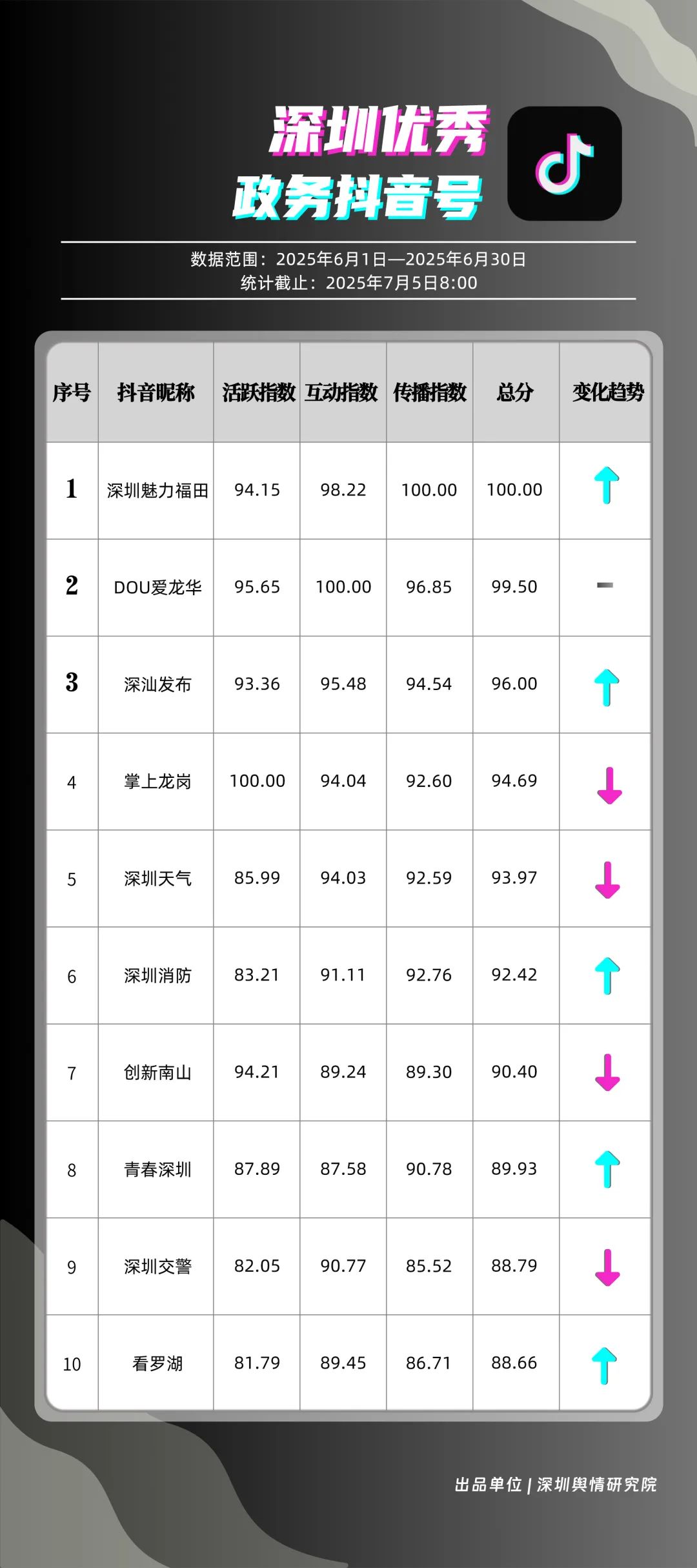 6月,“深圳魅力福田”“DOU爱龙华”“深汕发布”“掌上龙岗”“深圳天气”“深圳消防”“创新南山”“青春深圳”“深圳交警”“看罗湖”共10个政务抖音号获得“优秀政务抖音号”称号。6月,“深圳魅力福田”登顶,凭借其城市人文、社会热点类主题短视频,在传播指数得分创新高;“DOU爱龙华”“深汕发布”“掌上龙岗”紧随其后,通过各类热点、创意内容提升传播效能。“深圳天气”“深圳消防”也表现突出,短视频内容兼具“信息传递”与“情感共鸣”,用户参与度持续提升,不断为网民传播有价值的政务信息资讯。