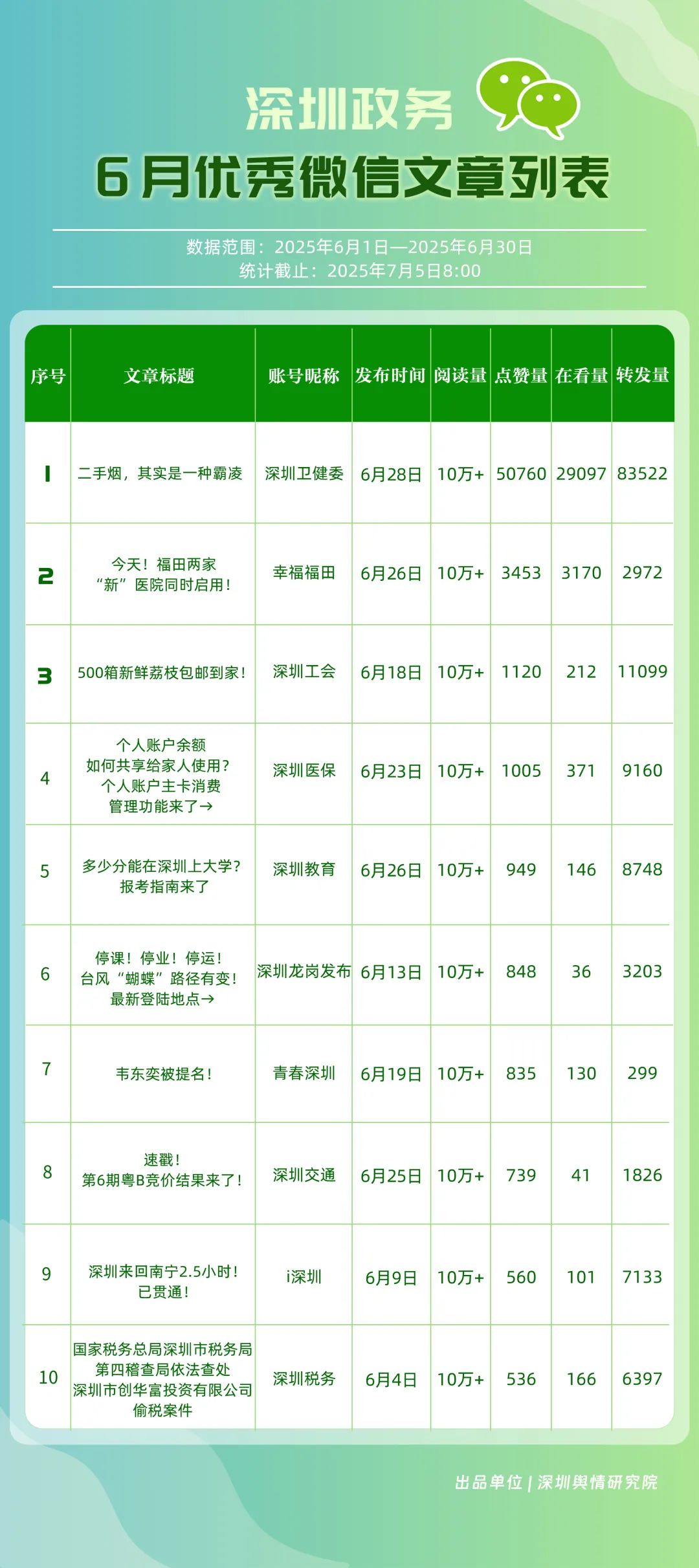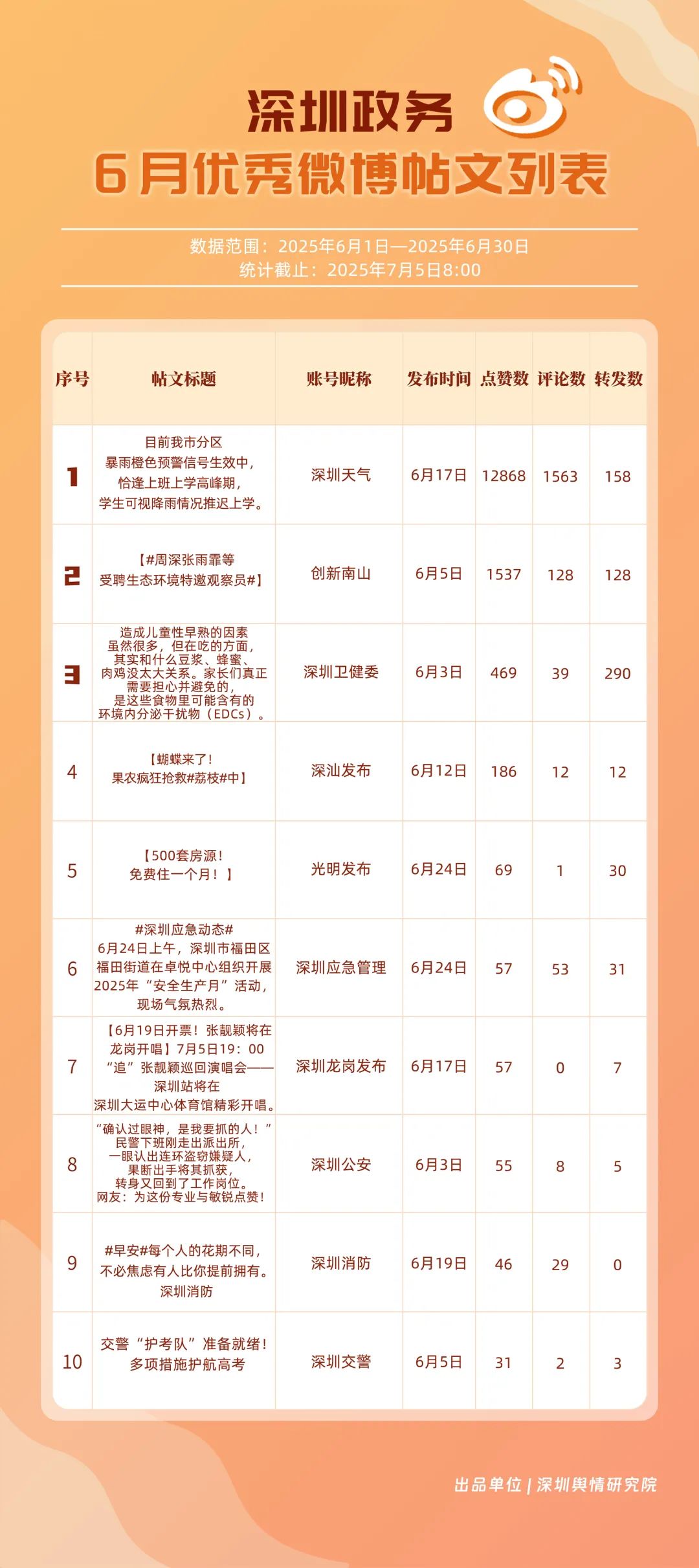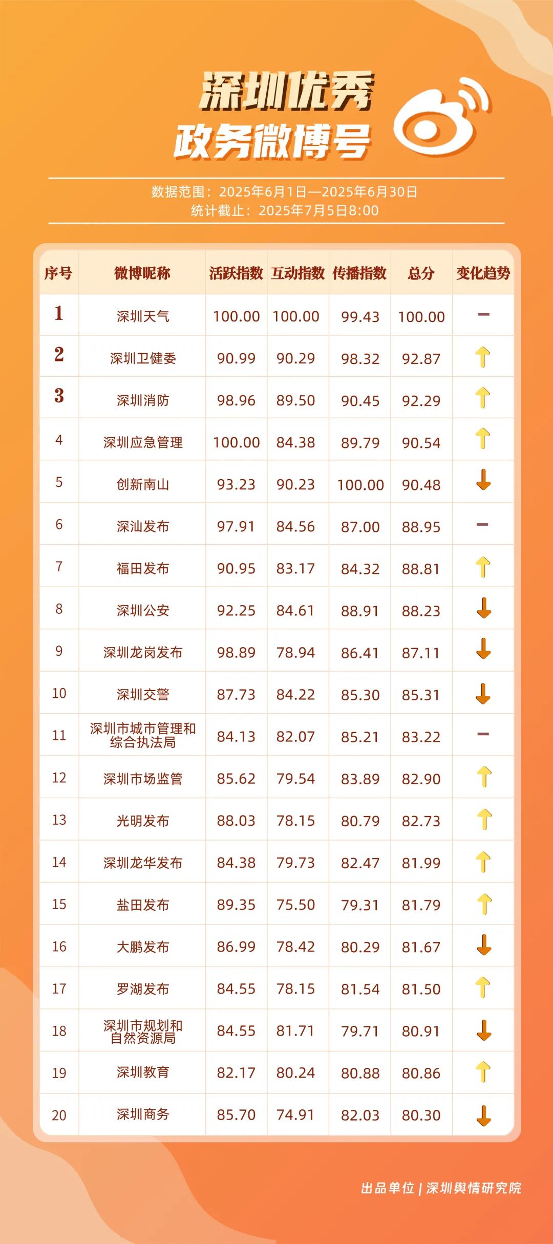 6月,“深圳天气”“深圳卫健委”“深圳消防”“深圳应急管理”“创新南山”“深汕发布”“福田发布”“深圳公安”“深圳龙岗发布”“深圳交警”等20个账号入选“优秀政务微博号”。其中,“深圳天气”以活跃、互动指数双满分稳居第一,气象服务信息及时性与科普内容趣味性获市民高度认可;“深圳卫健委”“深圳消防”“深圳应急管理”分别位列2至4位,通过热点话题联动医疗、消防、应急知识科普扩大影响力,政务微博矩阵在突发事件响应与民生服务中作用凸显。