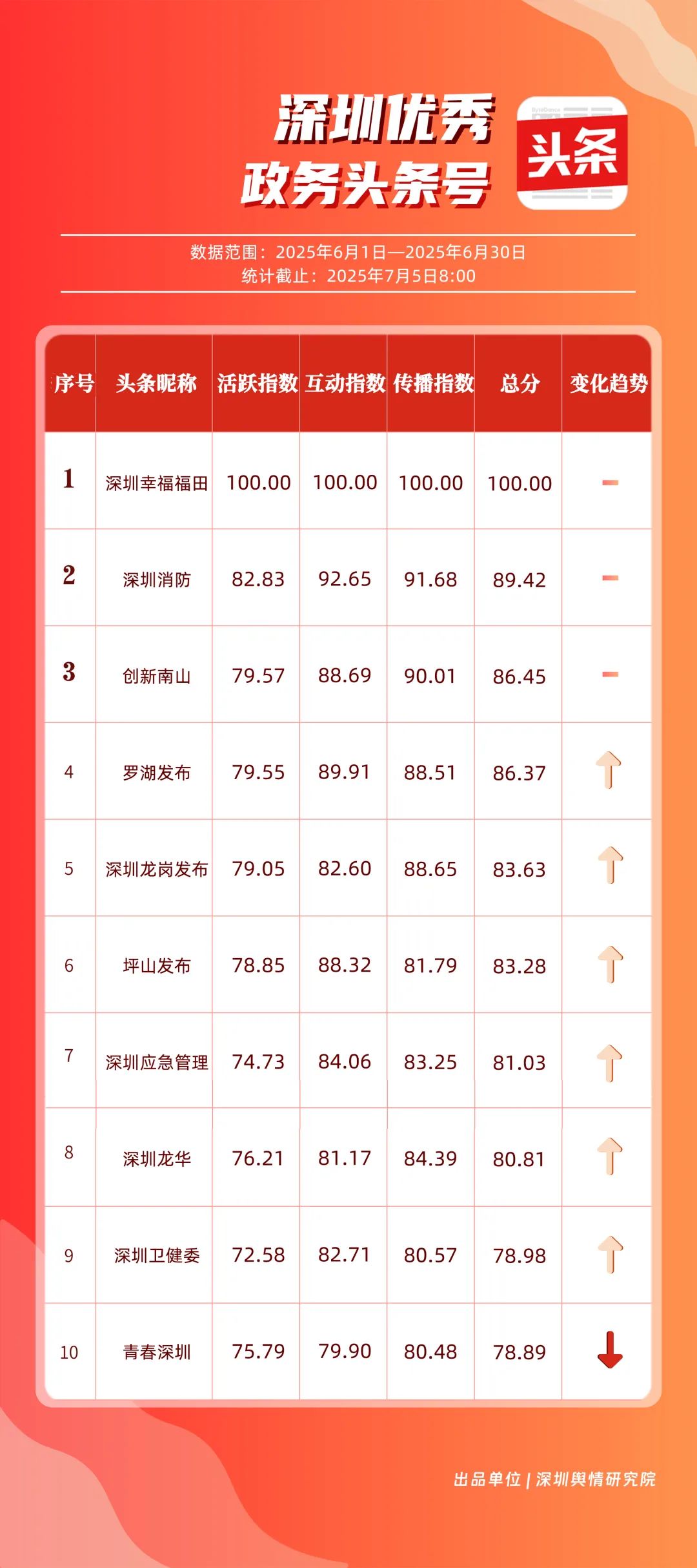 6月,“深圳幸福福田”“深圳消防”“创新南山”“罗湖发布”“深圳龙岗发布”“坪山发布”“深圳应急管理”“深圳龙华”“深圳卫健委”“青春深圳”共10个政务头条号入选“优秀政务头条号”榜单。“深圳幸福福田”“深圳消防”“创新南山”连续位居榜单前3名,内容具备较强的吸引力。“罗湖发布”“深圳龙岗发布”排名也在榜单前列,排名较5月有所上升,在区域形象宣传与民生服务中持续发力。