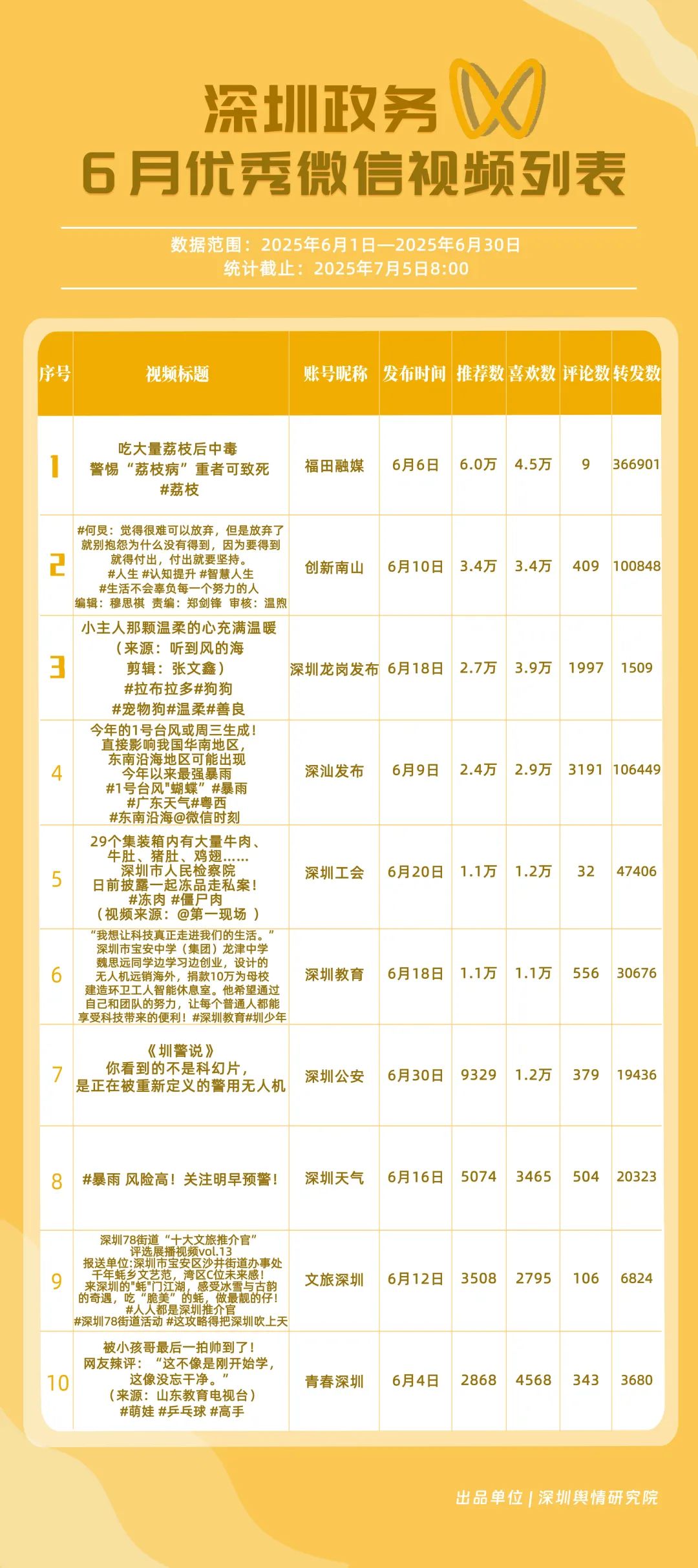 6月,获得“深圳优秀政务微信视频号”称号的是“福田融媒”“深汕发布”“深圳龙岗发布”“创新南山”“深圳教育”“深圳天气”“青春深圳”“深圳公安”“文旅深圳”“深圳应急管理”。其中,“福田融媒”以活跃、传播指数双满分居榜首,其视频《吃大量荔枝后中毒 警惕“荔枝病”重者可致死》获得超36万次转发,成为爆款案例;“深汕发布”“深圳龙岗发布”“创新南山”得分在90分以上,在互动、传播方面表现亮眼。这些优秀的政务微信视频号以各自的独特风格持续发力,为政务及民生信息传递开拓更鲜活、畅通的路径。