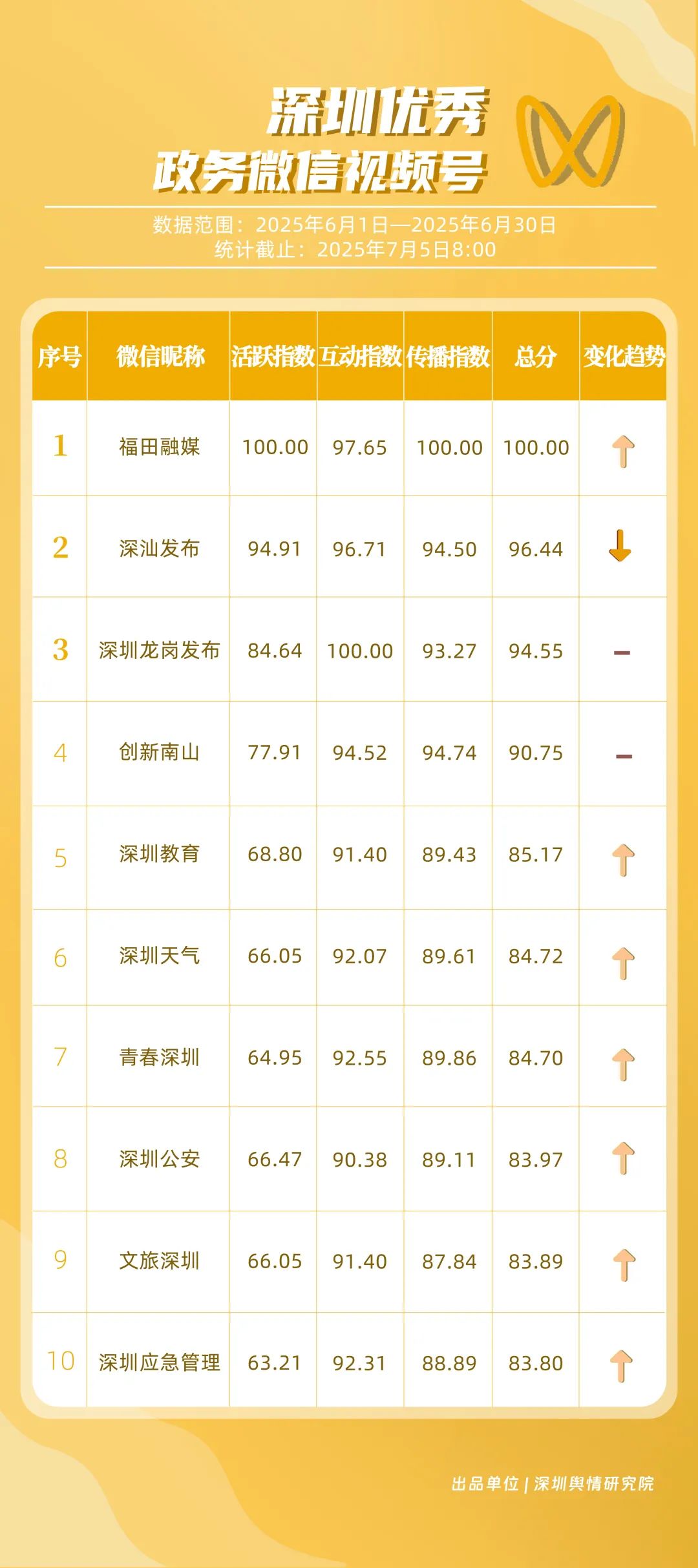 2025年6月期《深圳优秀政务新媒体矩阵》正式发布,邀您一同关注政务新媒体领域的标杆典范,它们凭借精准高效的传播效能与独具匠心的创新实践脱颖而出,共同构建起深圳政务传播的全新生态。