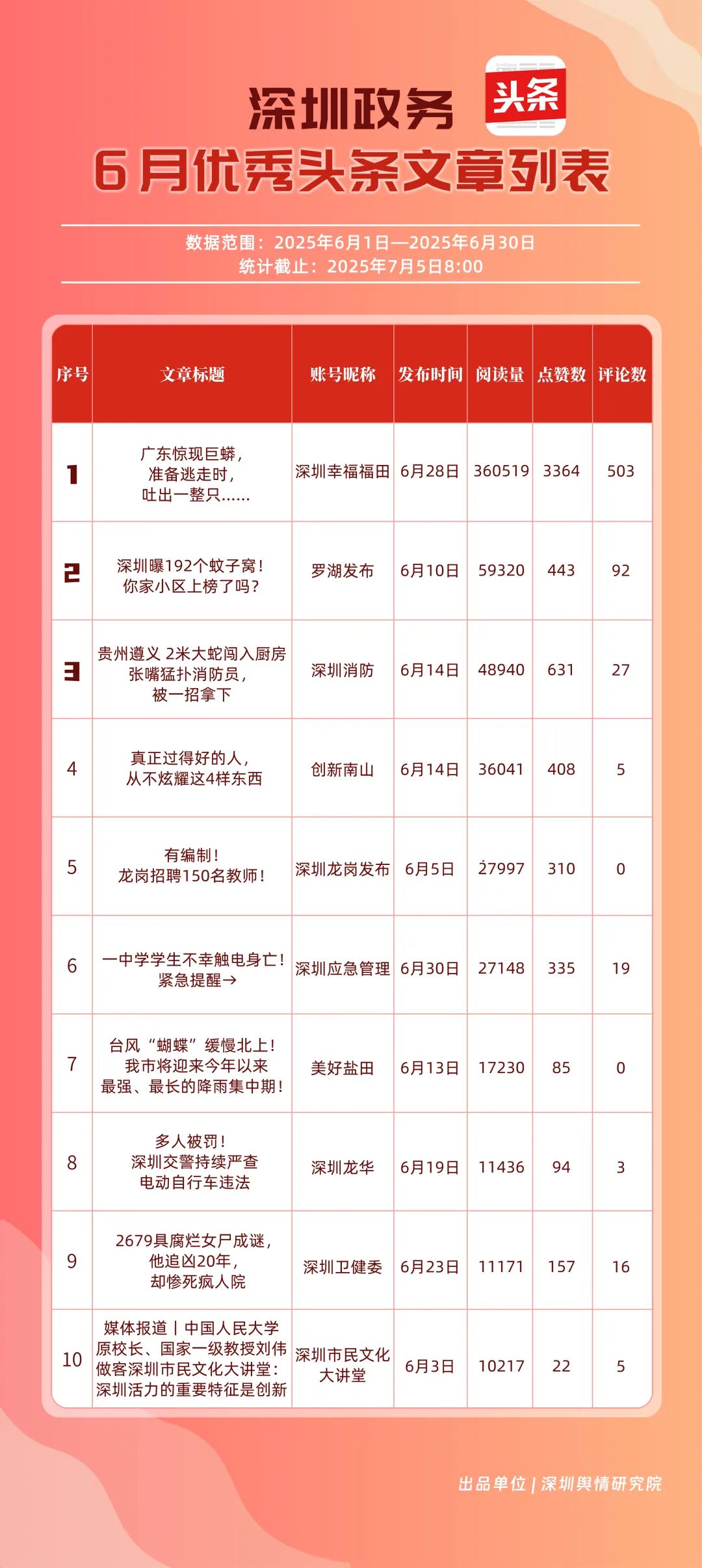本期榜单数据收集自微信(含公众号、视频号)、微博、抖音、今日头条,统计账号数量为227个,统计数据时间范围为2025年6月1日至6月30日,截止时间为7月5日8:00。