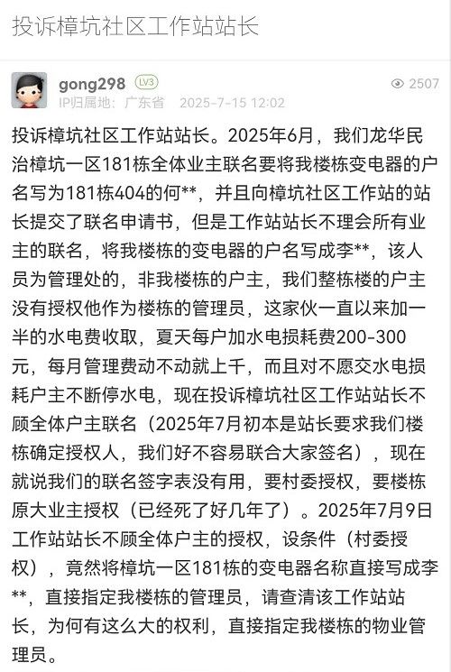 经核实,通博花园因变压器超负荷运载停电后,众多居民提出“抄表到栋”的诉求,民治街道樟坑社区积极响应,协调对接供电局、村股份公司、通博物业管理处等多单位,推进专变转公变实现抄表到栋等相关事宜,目前流程已基本完成,居民用电的问题也取得了阶段性成果。在推进该事项,办理低压用电开户申请时,樟坑社区收到181栋的《深圳市龙华民治通博花园小区181栋电抄表到栋总表代表选举投票结果公告》,该公告业主签名是否真实无从核实,因该地块原属樟坑股份合作公司,后续转卖给个人兴建,大部分已逐套出售,为典型的多业主小产权房,该楼栋建设方安排李某杰管理至今,且该楼栋电梯使用登记证也是李某杰办理。因小产权房每间套的业主产权确认难以核实,应急供电车已在现场供电近30天,无论是从供电局的发电成本、发电车噪音扰民还是响应大部分居民要求、尽快实现“抄表到栋”的角度出发,以楼栋实际管理员申请开户,才能最快速解决700多户居民用电的问题。感谢您对我们工作的理解和支持。