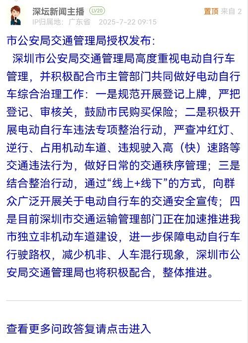 深圳市公安局交通管理局高度重视电动自行车管理,并积极配合市主管部门共同做好电动自行车综合治理工作:一是规范开展登记上牌,严把登记、审核关,鼓励市民购买保险;二是积极开展电动自行车违法专项整治行动,严查冲红灯、逆行、占用机动车道、违规驶入高(快)速路等交通违法行为,做好日常的交通秩序管理;三是结合整治行动,通过“线上+线下”的方式,向群众广泛开展关于电动自行车的交通安全宣传;四是目前深圳市交通运输管理部门正在加速推进我市独立非机动车道建设,进一步保障电动自行车行驶路权,减少机非、人车混行现象,深圳市公安局交通管理局也将积极配合,整体推进。
