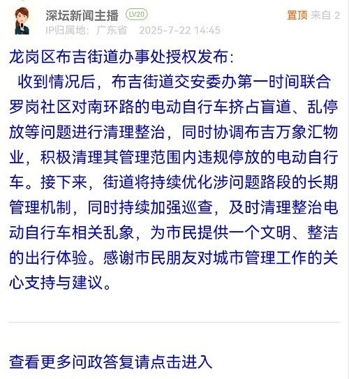 收到情况后,布吉街道交安委办第一时间联合罗岗社区对南环路的电动自行车挤占盲道、乱停放等问题进行清理整治,同时协调布吉万象汇物业,积极清理其管理范围内违规停放的电动自行车。接下来,街道将持续优化涉问题路段的长期管理机制,同时持续加强巡查,及时清理整治电动自行车相关乱象,为市民提供一个文明、整洁的出行体验。感谢市民朋友对城市管理工作的关心支持与建议。