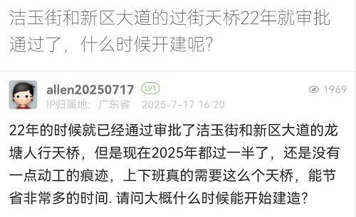 16. 帖文《洁玉街和新区大道的过街天桥22年就审批通过了,什么时候开建呢?》