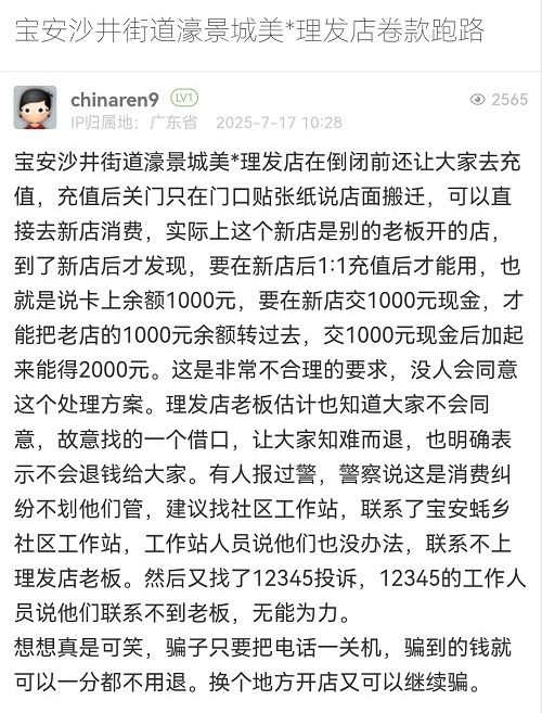 39. 帖文《宝安沙井街道濠景城美*理发店卷款跑路》