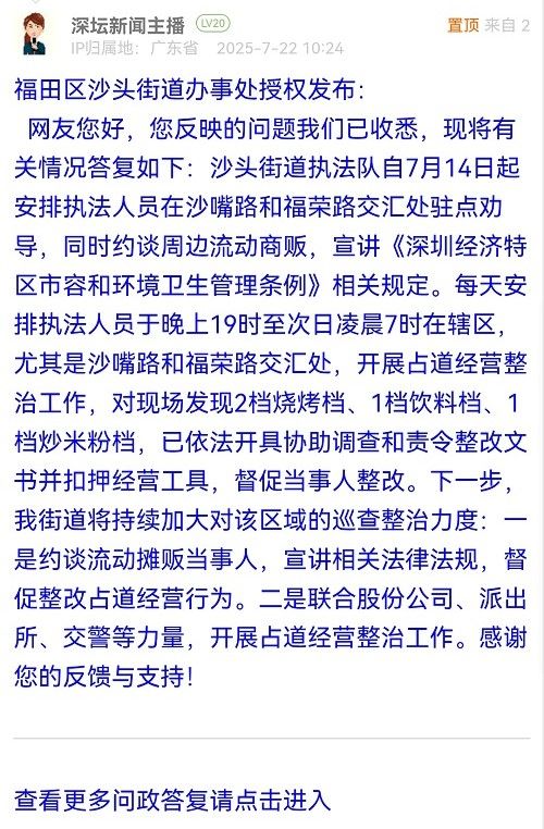 网友您好,您反映的问题我们已收悉,现将有关情况答复如下:沙头街道执法队自7月14日起安排执法人员在沙嘴路和福荣路交汇处驻点劝导,同时约谈周边流动商贩,宣讲《深圳经济特区市容和环境卫生管理条例》相关规定。每天安排执法人员于晚上19时至次日凌晨7时在辖区,尤其是沙嘴路和福荣路交汇处,开展占道经营整治工作,对现场发现2档烧烤档、1档饮料档、1档炒米粉档,已依法开具协助调查和责令整改文书并扣押经营工具,督促当事人整改。下一步,我街道将持续加大对该区域的巡查整治力度:一是约谈流动摊贩当事人,宣讲相关法律法规,督促整改占道经营行为。二是联合股份公司、派出所、交警等力量,开展占道经营整治工作。感谢您的反馈与支持!