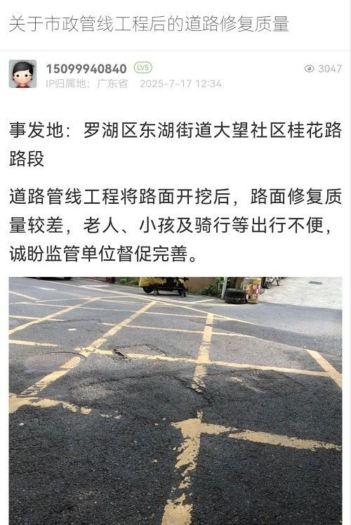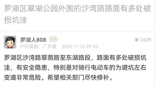 7. 帖文《罗湖区翠湖公园外围的沙湾路路面有多处破损坑洼》