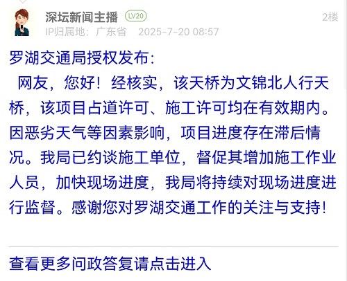 网友,您好!经核实,该天桥为文锦北人行天桥,该项目占道许可、施工许可均在有效期内。因恶劣天气等因素影响,项目进度存在滞后情况。我局已约谈施工单位,督促其增加施工作业人员,加快现场进度,我局将持续对现场进度进行监督。感谢您对罗湖交通工作的关注与支持!