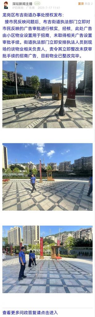 接市民反映问题后,布吉街道执法部门立即对市民反映的广告审批进行核实,经核,此处广告由小区物业设置用于招商,未取得相关广告设置审批手续。街道执法部门立即安排执法人员到现场约谈物业相关负责人,责令其立即整改未获审批手续的招商广告,目前物业已整改完毕。