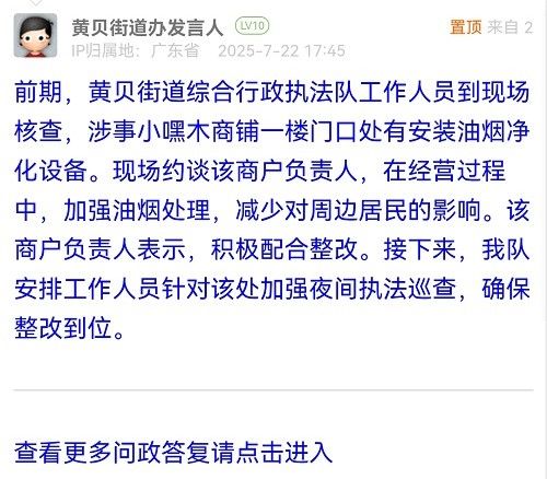 前期,黄贝街道综合行政执法队工作人员到现场核查,涉事小嘿木商铺一楼门口处有安装油烟净化设备。现场约谈该商户负责人,在经营过程中,加强油烟处理,减少对周边居民的影响。该商户负责人表示,积极配合整改。接下来,我队安排工作人员针对该处加强夜间执法巡查,确保整改到位。